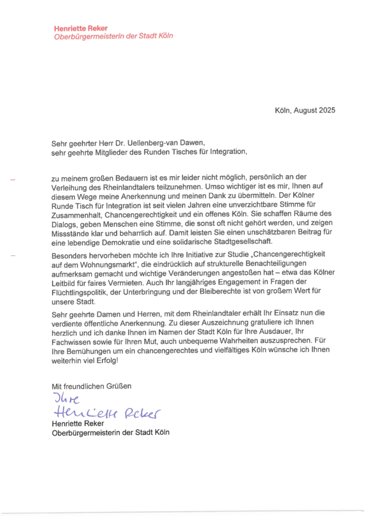 Am 25. August 2025 wurde der Kölner Runden Tisch für Integration mit dem Rheinlandtaler des Landschaftsverbands Rheinland ausgezeichnet. Lesen Sie hier die Laudatio des stellvertretenden Vorsitzenden der Landschaftsversammlung Prof. Dr. Jürgen Wilhelm.